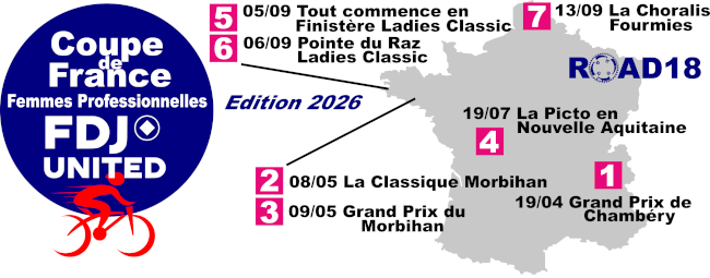 Le calendrier : 19/04 Grand Prix de Chambéry 1.1 08/05 La Classique Morbihan 1.1 09/05 Grand Prix du Morbihan 1.1 19/07 La Picto en Nouvelle Aquitaine 1.1 05/09 Tout commence en Finistère Ladies Classic 1.1 06/09 Pointe du Raz Ladies Classic 1.Pro 13/09 La Choralis Fourmies 1.Pro ![]() Coupe de France FP FDJ United 2026 | © Franck Sylvain FRUCH / ROAD18 A lire aussi : Le Down Under pour ouvrir Visma : le point La Laboral en couleurs Latest News 21/12 Febe Jooris promue![]() |