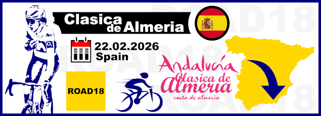![]() Clasica De Almeria 2026 | © Franck Sylvain FRUCH / ROAD18 Palmarès de la Clasica de Almeria : 2025 Ally Wollaston (NZL, FDJ-SUEZ) 2024 Lauren Stephens (USA, Cynisca Cycling) 2023 Emilie Fortin (CAN, Cynisca Cycling) A lire aussi : Setmana, étape 2 : les infos Setmana Val. #1 : Demi sans question Paris-Roubaix : les équipes L'Enfer revient plus chaud Setmana, étape 1 : les infosDossiers : GIRO D'ITALIA TOUR DE FRANCE CHAMPIONNATS DU MONDE![]()