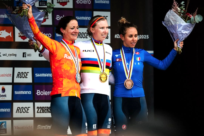 Championnats du monde de Gravel. Lorena Wiebes devance Marianne Vos. Shirin Van Anrooij désappointée. ![]() Le podium 2025 | © UCI