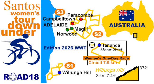 Les étapes : 17/01 Willunga Hill - Willunga Hill (137 km) 18/01 Magill - Paracombe (131 km) 19/01 Norwood - Campbelltown (126 km) 21/01 Women's One-Day Race (94 km) Murray Street, Tanunda, circuit 7.9 km ![]() Santos Tour Down Under 2026 | © Franck Sylvain FRUCH / ROAD18 Palmarès : 2025 Noemi Rüegg (SUI, EF-Oatly-Cannondale) 2024 Sarah Gigante (AUS, AG Insurance-Soudal Team) 2023 Grace Brown (AUS, FDJ-SUEZ) 2022 Ruby Roseman-Gannon (AUS, Team BikeExchange Jayco) 2021 Sarah Gigante (AUS, Team TIBCO-Silicon Valley Bank) 2020 Ruth Winder (USA, Trek-Segafredo) 2019 Amanda Spratt (AUS, Mitchelton-Scott) 2018 Amanda Spratt (AUS, Mitchelton-Scott) 2017 Amanda Spratt (AUS, Orica-Scott) 2016 Katrin Garfoot (AUS, Orica-AIS) 2015 Valentina Scandolara (ITA, Orica-AIS) 2014 Loes Gunnewijk (NED, Orica-AIS) 2013 Kimberley Wells (AUS, Fearless Women) 2012 Judith Arndt (GER, Orica-AIS) 2011 Chloe Hosking (AUS, HTC-Highroad) UCI depuis 2016 2021 et 2022 : Santos Festival of Cycling A lire aussi : Visma : le point La Laboral en couleurs Latest News 21/12 Febe Jooris promue Le Mondial québécois![]() |
