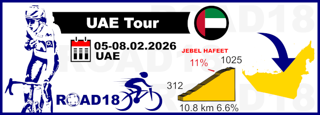 Les étapes : 05.02 Al Mirfa - Madinat Zayed (111 km) 06.02 Dubai Police Academy - Hamdan Bin Mohamed Smart University (145 km) 07.02 Abu Dhabi TeamLab Phenomena - Abu Dhabi Breakwater (121 km) 08.02 Al Ain Hazza Bin Zayed Stadium - Jebel Hafeet (156 km) ![]() UAE Tour Women 2026 | © Franck Sylvain FRUCH / ROAD18 Palmarès de l'UAE Tour Women : 2025 Elisa Longo Borghini (ITA, UAE Team ADQ) 2024 Lotte Kopecky (BEL, Team SD Worx-Protime) 2023 Elisa Longo Borghini (ITA, Trek-Segafredo) A lire aussi : Mallorca : la Movi' en force LBL : les équipes Pionera : la 2 pour de vrai La Flèche Wallonne : les équipes Salvador #4 : Patino la joue parfaitementDossiers : GIRO D'ITALIA TOUR DE FRANCE CHAMPIONNATS DU MONDE![]() |