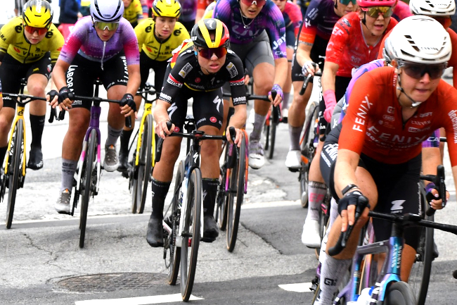 de Pauline Ferrand-Prévot (Team Visma | Lease a Bike), déjà en jaune depuis la veille au col de la Madeleine,